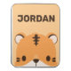 This design features cute tiger cartoon illustration with personalized name in brown modern sans serif font style on pastel orange background.