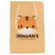 This design features cute tiger cartoon illustration with personalized name in brown modern sans serif font style on pastel orange background.