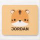 This design features cute tiger cartoon illustration with personalized name in brown modern sans serif font style on pastel orange background.