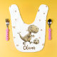 This cute baby bib features a funny whimsical T-Rex dinosaur kicking a soccer ball. Perfect for the little soccer fan in your life! Customize it with your baby's name for a truly unique and personalized gift.