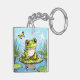 Adorable frog sitting on a lily pad with a cute butterfly on a pond.