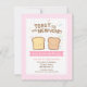 Invite your friends over for a New Year celebrations with this cute pun amusing invitation design! The casual handwritten like text reads "Toast to the New Year!" Instead of champagne and raising your glasses, how about toasts of cute smiling bread with colourful confetti in shapes of circles, stars and squares flying in the background. A pink and white slanted stripes pattern in the background. The recipients are going to smile on receiving this fun and cheerful cartoon invitation!