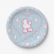 These paper party plates feature cute Toy Poodle dogs that have been groomed and have heart-shaped paw prints. Pink and white on a light blue background. Great for kids parties.