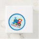 The favor tags are 2 sided. The first side features a red, yellow, and blue train engine and the words "Thank You". The second side has a small space for a message and the child's name.