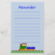 At the bottom of this lined stationery, a cute train is on the railroad tracks. The light blue paper also has dark blue display text at the top for the boy's name. You can edit the black text to show the child's name.