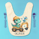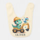 This personalized adorable baby bib design features a charming baby dinosaur joyfully driving a miniature construction vehicle. With its playful expression and vibrant colors, this delightful creation adds a touch of enchantment to any space, appealing to everyone, especially kids and babies.