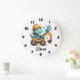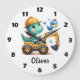This personalized adorable clock features a charming baby dinosaur joyfully driving a miniature construction vehicle.