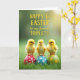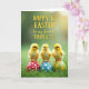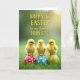 This card shows three tiny yellow baby birds standing in a neat row, each one balanced on a shiny egg-shaped ornament as if they’re sharing a sweet moment together 🌷. One bird perches on a deep red egg with small white dots, another stands on a calm teal egg with matching white dots, and the third rests on a lime-green egg dotted with golden-yellow spots 🐰. Their fluffy feathers look soft and downy, and their close spacing suggests a gentle, affectionate bond like close friends who stick together. Behind them is a blurred green background that feels like a garden or grassy field, with soft circles of light that add depth. A warm beam of golden light comes from the upper right, giving the birds and eggs a sunny glow. Across the top, the message “HAPPY 1st EASTER to my favorite TRIPLETS!” appears in rounded yellow lettering, centered and easy to read. The red, teal, and lime eggs line up beneath the text, each with glossy highlights that catch the light.