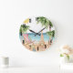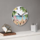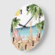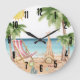 A cool watercolor beach theme with shades of pink and teal, setting the vibe for a beach escape or vibe. Cute pink and white beach chair, umbrella, and even a flamingo floaty for some extra fun. Palm trees swaying, shells to collect—it's all about those chill tropical beach vibes. With modern fonts adding a stylish twist. Great for a vacation house, or just if you want to bring a little tropical vibe into your home. Cute Girly Tropical Coastal Watercolor Beach Large Clock
