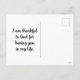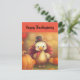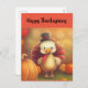 Adorable picture of a baby turkey wearing a pilgrim's hat, is featured on this Thanksgiving postcard. Front of postcard reads, "Happy Thanksgiving" and back of postcard reads, "I am thankful to God for having you in my life". A wonderful postcard to send family and friends for the Thanksgiving holiday!
