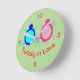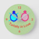 This awesome clock features a cute image of a blue turtle and a pink turtle side by side. The cute couple have eyes only for eachother and cute little tails. The shell of the turtle is made of two shades of pink for the female and blue for the male. These guys are turtally in love and would make a great gift for couples.