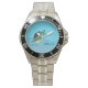 Has heft and feel of expensive stainless steel quartz watches. Good band with safety catch. I removed links, which is easy because engraved arrows show direction to push the linking pins. As always by this seller, the image (a railroad logo) is a perfect reproduction of my emailed image, and is precisely spaced and aligned.