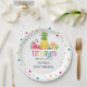 Cute Watercolor Tropical Fruit 'Tutti Fruitti Baby Shower Paper Plates. Design features colorful text which reads 'Tutti Frutti - a little cutie is on the way!', an array of juicy mouthwatering summer fruits, and colorful confetti.