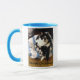 A photograph of a cute black and white tuxedo cat is enjoying their partially unwrapped Christmas present. The text says, "Meowy Christmas!" The design is printed on both sides of the mugs. Thank you for shopping at CherylsArtPhotos on Zazzle.