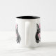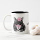 Cute ceramic mug with watercolor artwork of a black and white tuxedo cat with pink flower and collar just chilling. Black text reads chillin and can be personalized to read what you want. Too cute gift idea for cat lovers.