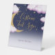 This is an adorable baby girl's first birthday party pedestal sign based on the “Twinkle twinkle little star” nursery rhyme. The design features a cute handwritten script calligraphy font, a golden moon with gold stars and cute fluffy clouds in a twinkling starry night sky.