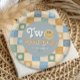 This groovy boys 2nd birthday paper plate design captures 70s vibes with a blue pastel chequered border. Fully customizable, it includes space for a name in a retro script. Perfect for a cute "Two cool dude" boho birthday, this playful blue smile design adds charm to your little one's special day!