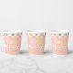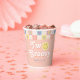 This groovy girls' 2nd birthday paper cup captures retro 70s vibes with a cute pink theme, floral accents, and a pastel chequered design. The cup includes space for a name in a girly script. Perfect for a "Two Groovy" boho birthday.