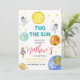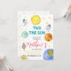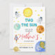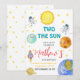 Adorable outer space themed second birthday invitation featuring a cute sun, planets, rocket, astronaut. Perfect for celebrating your little 2nd birthday kid with colorful cosmic party theme.