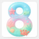 A vibrant and adorable 3D graphic illustration of the number "8" decorated with an under-the-sea theme. Features a smiling starfish, crab, seaweed, and a seashell.