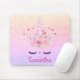 Beautiful Mouse Pad featuring a cute Pink Unicorn face with lovely magenta pink tiny little hearts on a faux glitter rainbow background. A lovely pink text name which you can change from the Personalize menu.