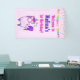 A birthday banner with a whimsical drawing of a cool and funky pink cubby unicorn which has a purple mane and tale. This cute creature is wearing heart-shaped sunglasses and is decorated with little stars. Pink watercolor background.