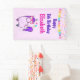A birthday banner with a whimsical drawing of a cool and funky pink cubby unicorn which has a purple mane and tale. This cute creature is wearing heart-shaped sunglasses and is decorated with little stars. Pink watercolor background.
