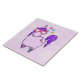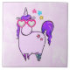 A ceramic tile with a whimsical drawing of a cool and funky pink cubby unicorn which has a purple mane and tail. This cute creature is wearing heart-shaped sunglasses and is decorated with little stars. Pink watercolor background.