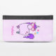 A phone case wallet with a whimsical drawing of a cool and funky pink cubby unicorn which has a purple mane and tale. This cute creature is wearing heart-shaped sunglasses and is decorated with little stars. Pink watercolor background.