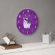 A clock with a whimsical drawing of a cool and funky pink unicorn which has a purple mane and tale. This cute creature is wearing heart-shaped sunglasses and is decorated with little stars and a heart. Purple striped background.