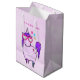 Thank you gift bag with a whimsical drawing of a cool and funky pink cubby unicorn which has a purple mane and tale. This cute creature is wearing heart-shaped sunglasses and is decorated with little stars. Pink watercolor background.