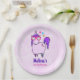 Paper plates with a whimsical drawing of a cool and funky pink unicorn which has a purple mane and tale. This cute creature is wearing heart-shaped sunglasses and is decorated with little stars. Pink watercolor background.