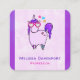 Square business cards with a whimsical drawing of a cool and funky pink unicorn which has a purple mane and tale. This cute creature is wearing heart-shaped sunglasses and is decorated with little stars. Pink watercolor background with a bright purple border on the left and right sides.