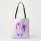 A tote bag with a whimsical drawing of a cool and funky pink cubby unicorn which has a purple mane and tail. This cute creature is wearing heart-shaped sunglasses and is decorated with little stars. Pink watercolor background.