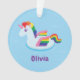 A colorful ornament which features a cute winged unicorn pool float with colours of the rainbow for its mane, tail and wings. Personalize with child's name.