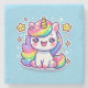This cute, cartoon-style unicorn sits happily on a bright blue background, featuring a vibrant rainbow mane and tail with a golden horn. Its joyful expression and sparkling eyes are surrounded by twinkling stars and magical sparkles, creating a whimsical and fun design. Perfect for anyone who loves fantasy, bright colors, and adorable characters, this playful unicorn adds a touch of charm to any space.
