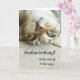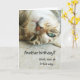 On the front of this birthday card, a gray tiger striped cat lies upside down, looking at you with green eyes. The text says "Another birthday? Well, look at it this way..." The inside text says "...You're not as old as you will be next year! Happy Birthday!" All the text is easily customized, so you may make it say whatever you'd like. Cute!