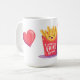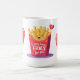 A cute and colorful cartoon illustration of a red French fries carton with a happy kawaii smiling face. The design features a floating red heart and the romantic funny pun quote "I only have FRIES for you". The image has a white sticker border, making it perfect for Valentine's Day greeting cards, fast food lovers, and humorous romantic gifts. Isolated design.