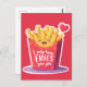 A cute and colorful cartoon illustration of a red French fries carton with a happy kawaii smiling face. The design features a floating red heart and the romantic funny pun quote "I only have FRIES for you". The image has a white sticker border, making it perfect for Valentine's Day greeting cards, fast food lovers, and humorous romantic gifts. Isolated design.
