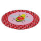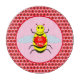 There is a pattern of small red sunflowers surrounding the bee.