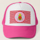 This awesome hat features a cute little Valentines Bee. The Bee has a furry yellow body with black stripes and red antennae. It is holding on to a red heart shaped piece of honeycomb and is surrounded with sunflowers. Each flower has red petals to match the romantic bee and a black centre. There is white text in the middle of the honeycomb that says the romantic message "Bee mine". This little bee is ideal for showing your love for someone special.