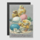 Three adorable yellow vintage chicks in a glass bowl with colored Easter eggs.