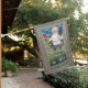 Cute vintage Easter card illustration featuring small boy in sailor suit sitting a rustic fence holding two bunnies with Easter eggs in the grass behind him.