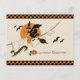 A cute, black, white, and orange, vintage illustration of a little, old witch, riding her broom stick, over a clothesline with towels and blankets hanging off of it. The witch is riding across a bright, orange, full moon, with a group of black bats. On the illustration it says, "Halloween Greetings," next to a little pumpkin. The witch has white hair, a black pointed hat, and a black dress with a white collar on it. Very whimsical and adorable. Great for those who love Halloween, vintage art, pumpkins, and witches. Check out my shop, SpookyGhost, for more vintage Halloween gifts.