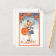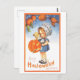 This postcard is a reproduction of a vintage Halloween postcard that features a cute girl with her puppy and a jack-o-lantern.
