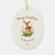 Merry Christmas! This cute little reindeer has arrived to greet you during the holidays. The precious fawn sports a bright red bow and green holiday foliage. The design has vintage origin, done in watercolor. The red script for the text is to be edited by you. Please change the names and year to those you want.