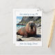 Walrus themed postcard to say hello and keep in touch with friends and family while travelling or who live long distance. A cute walrus laying on a sandy beach by the ocean on a sunny day. Background of cliffs and blue ocean waves.