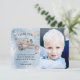 Cute thank you card from the birthday boy! Design features a blue watercolor sky background with little stars and fluffy clouds, a little boy flying a vintage aeroplane, hot air balloons, a photograph of your choice and a thank you template that is easy to customize.
