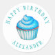 Happy birthday cupcake sticker featuring a watercolor blue cupcake with the text 'Happy Birthday' and Your Name. Add this birthday sticker to a box of cupcakes or to a gift package/present or seal a birthday card envelope with it.