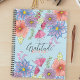 This is a customizable notebook that exudes tranquility and elegance. The cover is awash in a soothing light blue hue, serving as a canvas for an intricate floral print. An array of flowers in soft pastel shades of coral, purple, and pink are scattered artistically across the cover, creating a harmonious dance of colors. These blossoms are accentuated by delicate green leaves of various sizes, adding a touch of nature’s elegance to the design. At the center of the notebook’s cover, the words “Gratitude Journal” are inscribed in a stylish cursive font. This central inscription invites users to pen down their daily thanks amidst this blossoming garden of serenity. The notebook features a spiral binding on its left side, adding a practical touch to its aesthetic appeal.